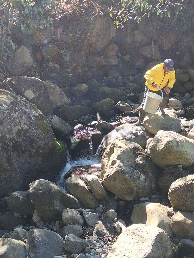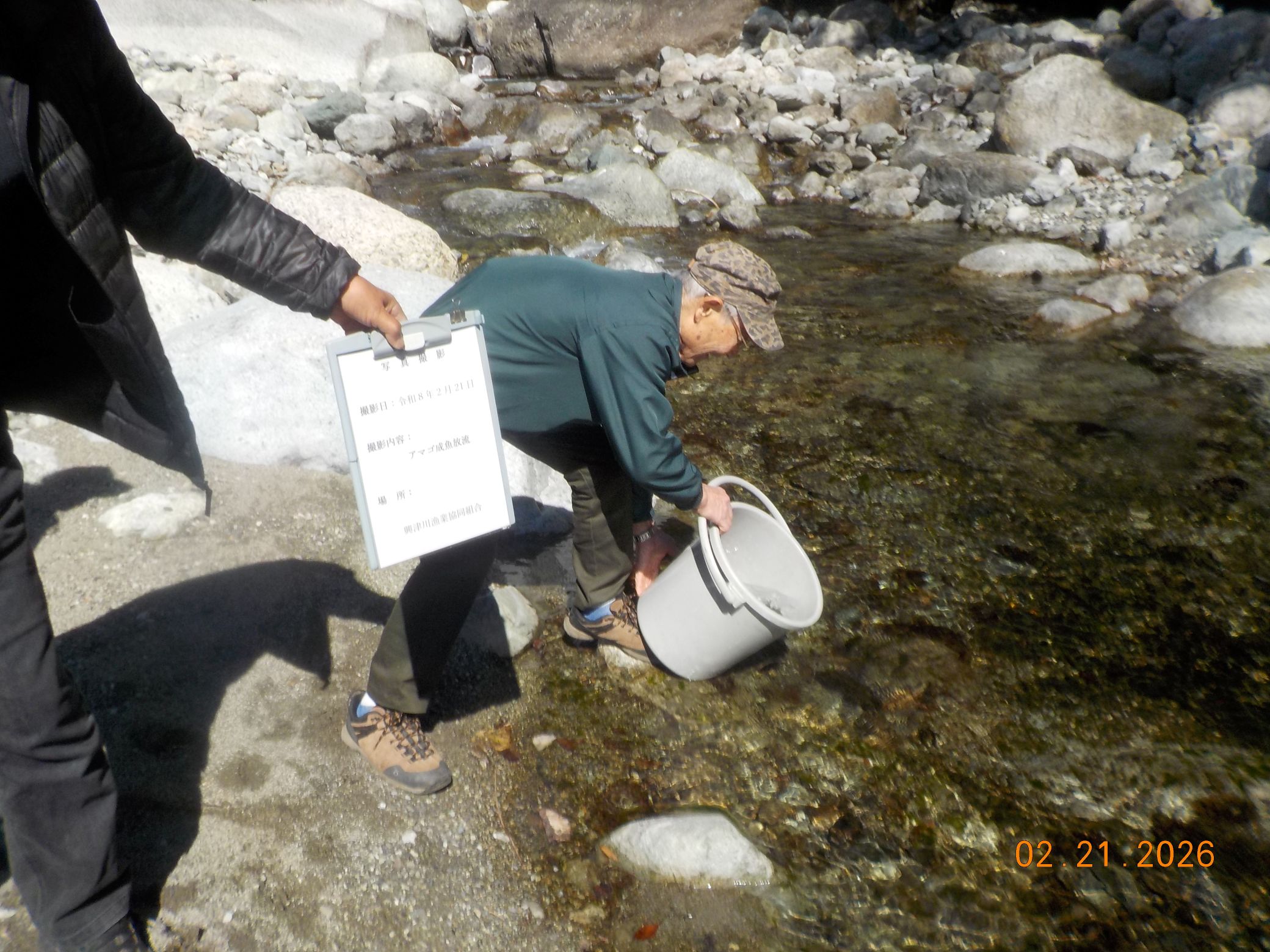 R8.2.22 上流域(本流は、旧中河内小学校より上流)(支流は湯沢・樽・神沢原周辺)に成魚アマゴを100kg放流いたしました。