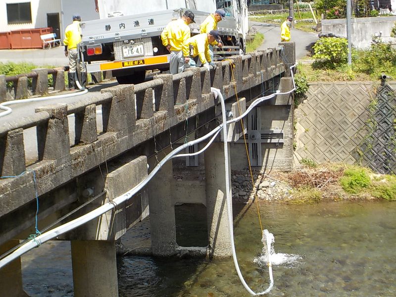 本日本年度第一回目の稚鮎を上流から下流にかけて960㎏放流しました。 当河川で放流する鮎は裾野市深良(ふから)にある静岡県内水面漁連鮎種苗センターで衛生上安全に育てられま した。