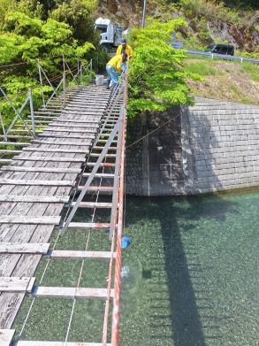 川岸に下りられない場所は、端からバケツに紐を2本つけて丁寧に放流しております。