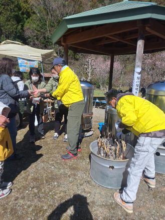 西里やませみの湯前の広場にて OYAMAdeマルシェが開催され、興津川漁協も鮎・アマゴの塩焼きを提供させていただきました。